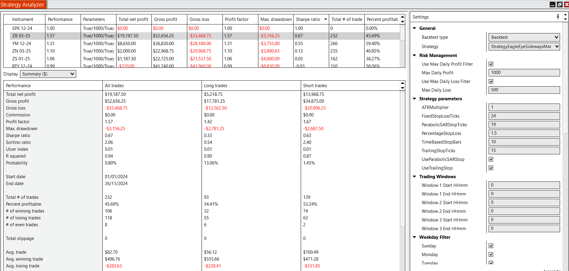 StrategyEagleEyeSidewaysMarketV2 is an optimized automated trading strategy for NinjaTrader 8, designed for dynamic market conditions and improved risk management. It uses multiple technical indicators, including Parabolic SAR, ADX, Bollinger Bands, and MACD, to detect sideways markets and trade within specified time windows. The strategy features flexible risk controls, such as fixed and ATR-based stop-losses, daily profit and loss filters, and multiple weekday and trading window options. It can enter both long and short positions, with the ability to reverse trades based on market conditions. Additionally, it offers configurable profit targets, trailing stops, and Parabolic SAR stop-loss functionality.